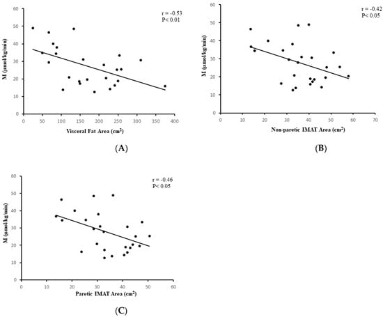 Correlation analysis with body composition. (A) Relationship between visceral fat area and glucose utilization (M) in stroke participants (n = 25; r = −0.53, p < 0.01); (B) Relationship between nonparetic intermuscular fat (IMAT) area and glucose utilization (M) in stroke participants (n = 26; r = −0.42, p < 0.05); (C) Relationship between paretic intermuscular (IMAT) fat area and glucose utilization (M) in stroke participants (n = 26; r = −0.46, p < 0.05).