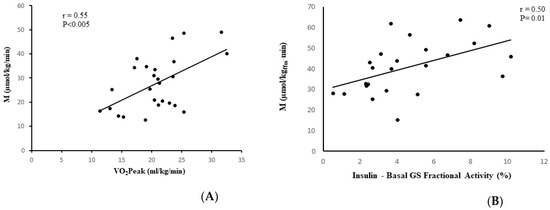 Correlation analysis with fitness and GS. (A) Relationship between VO2peak and glucose utilization (M) in stroke participants (n = 26; r = 0.55, p < 0.005). (B) Relationship between glucose utilization (M) and absolute change in GS fractional activity in paretic muscle in stroke participants (n = 24; r = 0.50, p = 0.01).