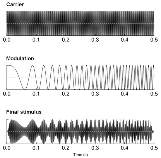The auditory chirp stimuli were designed in the MATLAB 2014 environment (The MathWorks Inc., Natick, MA, USA). The sounds were created as 440 Hz tones linearly modulated in the frequency window of 1 to 120 Hz (increasing modulation frequency); the modulation lasted 500 ms with 15 ms onset/offset linear ramps to avoid clicks [24]. The schematic representation of the stimulus is plotted in (Figure 1). The binaural presentation of sounds at 60 dBA (the relative loudness of sounds in air as perceived by the human ear) was performed through Beyer dynamic DT-1350 headphones (Beyerdynamic GmbH&Co, Heilbronn, Germany), while study participants watched a silent documentary movie on a screen in front of them [32]. Chirp stimuli were presented 450 times with ISIs set at 700–1000 ms.