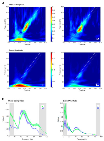 Phase-locking index and evoked amplitude curves (Figure 2B) were derived by averaging EFR in the time window of +50 ms separately for each frequency point starting from 2 to 120 Hz in 1 Hz step. The starting time point for averaging was set at the initiation time point for each stimulation frequency. The white diagonal line in (Figure 2A) represents the time-course of stimulation, and the white dashed line delineates the window for the analysis. The extracted PLI/EA curves were further subjected to a bootstrap t-test (1000 iterations, p < 0.05) to perform a point-to-point comparison between study groups. 95% bootstrapped confidence intervals were used to assess significance. Although the bootstrap test is less conservative option for solving the multiple comparison problem than the Bonferroni test, it is robust, stable [38] and widely used in EEG analysis [39,40,41]. Additionally, to allow for comparison to earlier reports, Pearson correlation was assessed between PLI/EA curves and positive, negative, total PANSS and hallucination subscale scores. A Bonferroni adjusted α-level of 0.0001 (0.05/480) was regarded as significant.