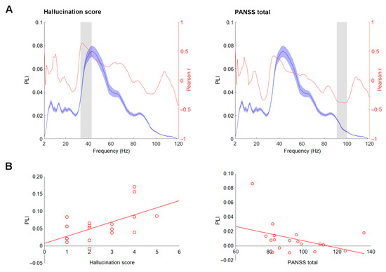 The associations between PLI/EA and clinical variables—positive, negative, total PANSS scores, and hallucination subscale score—were assessed in the patient group. None were significant at a Bonferroni adjusted α-level of 0.0001 (0.05/480). However, we report the associations with uncorrected p values (p < 0.05) for exploratory and comparative purposes. The PLI values in the 32–43 Hz range showed a sign of positive correlation to the hallucination score (0.403 < r < 0.636, 0.003 < p < 0.044). The total PANSS scores showed a sign of negative relation to PLI values in the 91–100 Hz frequency window (−0.386 < r < −0.347, 0.028 < p < 0.049) and to EA values in the 95–101 Hz frequency window (−0.378 < r < −0.352, 0.030 < p < 0.048). For visualization purposes, the plots showing the course of Pearson r values for association between PLIs and hallucination scores, PLIs and total PANSS scores (Figure 3A), and corresponding scatterplots are depicted in Figure 3B.