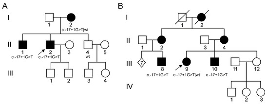 Pedigree tree of both families. (A) First family; (B) Second family. Arrows indicate the probands. Black circle/square: female-/male-affected individuals; open circle/square: female/male healthy individuals; wt = wild-type. LOD (logarithm of the odds) score was 2.107, assuming an X-linked dominant model of inheritance.