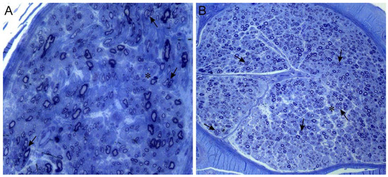 Sural nerve biopsies. Semithin sections stained with toluidin blue. (A) (20×): 17-year-old patient II-2, first family. (B) (10×): 18-year-old patient III-8, second family. Both biopsies show mild loss of large myelinated fibres, several clusters of regeneration (arrows) and few simple onion bulbs (asterisk).