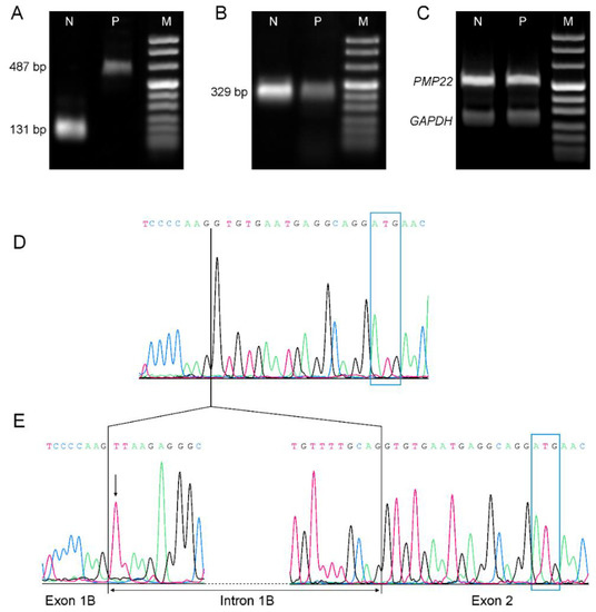 Using primers spanning intron 1B, the amplification of the sample from patient III-8 (P) resulted in a 487 bp—cDNA fragment, while the normal-control sample (N) showed the expected length of 131 bp (Figure 3A). Sequencing of the latter cDNA confirmed the normal splicing of intron 1B, whereas the patient’s cDNA demonstrated the retention of the entire intron in the amplified product (Figure 3D,E).