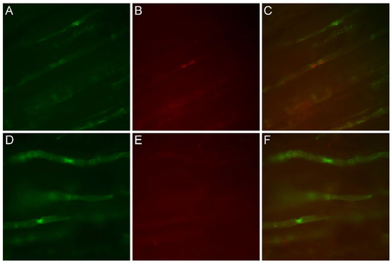 Red immunofluorescence confirmed membrane expression of Cx32 at paranodal loops and Schmidt-Lanterman incisures of a control nerve, which also showed MAG colocalization (Figure 4C). On the other hand, the patient’s nerve (III-8) only exhibited the green anti-MAG signal, with no evidence of the presence of Cx32 (Figure 4F).