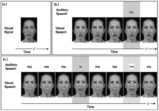 Example background, signal, and foil trial stimuli in Lalonde and Werner’s detection and discrimination tasks [51]. (a) Example of the visual signal for the auditory-only condition of both tasks. This single image remained on the screen throughout auditory-only testing. The auditory speech signal was identical to the audiovisual conditions. (b) Example of the audiovisual detection condition. The white portions of the timeline represent the background and no-signal trials. The gray portion of the timeline represents a signal trial. The visual speech repeated continuously, but auditory speech only occurred on signal trials. (c) Example of the audiovisual discrimination condition described in Section 6.1.2. The white portions of the timeline represent the background and no-signal trials. The gray portion of the timeline represents a signal trial, and the striped portion of the timeline represents a foil trial. The auditory and visual speech was /mu/ repeating in the background. On signal trials, both the auditory and visual speech changed. On foil trials, only the visual speech changed. Reproduced with permission from [51].