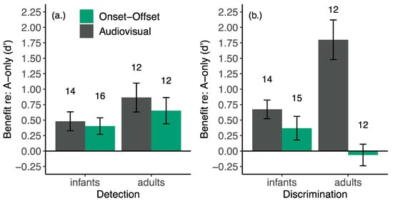 Mean and standard error of sensitivity benefit relative to the auditory-only condition for infants and adults on the (a) detection and (b) discrimination tasks. The numbers above each bar indicate the number of participants included in the condition. The visual signal in the audiovisual condition consisted of synchronous, congruent videos of the talker. In the onset-offset condition, the videos were replaced with two images of the talker, an open-mouth image that was displayed for the duration of the syllable and a closed-mouth image that was presented at all other times. The onset-offset video cued the potential timing of the acoustic syllable, but not its identity. Significant benefit was observed in all cases except adults’ discrimination in the onset-offset condition. Audiovisual benefit was significantly greater in adults than in infants on the discrimination task but not the detection task. Benefit only differed significantly across audiovisual and onset-offset conditions for adults’ discrimination. The onset-offset condition and discrimination task are discussed in greater detail in Section 6.1.2. Modified with permission from [51].