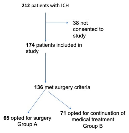 Between 2017 and 2019, a total of 212 patients were admitted for spontaneous ICH. In 38 cases, consent to enroll the patient in this study was not given, resulting in 174 cases enrolled in our current ICH study group. Among these 174 enrolled cases, a total of 136 patients met the criteria for the surgical indication. Consent for surgery was obtained in 65 cases (Group A), whereas the remaining 71 opted for medical treatment (Group B) (Figure 1).