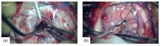 All surgeries were performed under general anesthesia, and all patients received surgery via a minimal craniotomy with navigation guidance (Curve 2.1; Brainlab, 81829 Munich, Germany). An operative microscope was used during all surgeries (Zeiss S88; Carl Zeiss AG, 73447 Oberkochen, Germany or Leica OHX; Leica Microsystems, 35578 Wetzlar, Germany). Surgery was performed following an adapted “keyhole” technique, as initially described by Tsementzis [20], combined with a retractor-less “dynamic retraction” technique adapted from the work of Spetzler et al. [21]. The approach to the hematoma was performed under neuronavigation guidance and with image injection in the surgical microscope (Captiview; Leica Microsystems, 35578 Wetzlar, Germany). The approach trajectory was chosen to be as short as possible by using the trans-sulcal or trans-Sylvian approaches while, at the same time, avoiding eloquent areas. Significant attention was given to the dissection of sulci and fissures to minimize the surgical sacrifice of the cerebral parenchyma. In all cases, minimal corticectomy was sought and was achieved by combing the angulation of the microscope with the surgical table rotation. Complete hematoma reduction was not considered the surgical endpoint as we opted for a subtotal evacuation of the ICH clot volume, thus allowing for the reduction in ICP and diminishment of secondary cerebral injury, at the same time, minimizing brain manipulation and surgical time (Figure 2, Figure 3 and Figure 4).