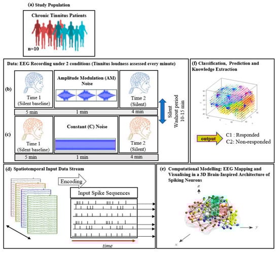 - Durai, M.; Sanders, P.; Doborjeh, Z.; Wendt, A.; Kasabov, N.; Searchfield, G. Prediction of tinnitus masking benefit within a case series using a spiking neural network model. In Brain Machine Interfaces: Implications for Science, Clinical Practice and Society; Elsevier BV: Amsterdam, The Netherlands, 2020. [Google Scholar]