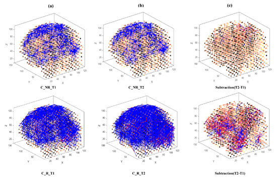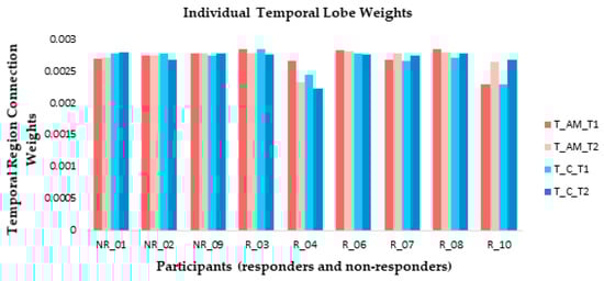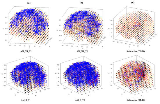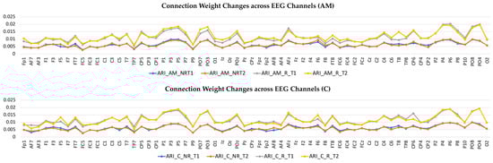 - Learning: The model was trained in an unsupervised learning mode, using the Spike Time Dependent Plasticity (STDP) learning rule [43]. SNN models were trained with EEG data before (T1) and after ARI stimulus presentation (T2) in both the AM and constant conditions. The T2 model was subtracted from the T1 model to illustrate differences in connectivity during ARI.