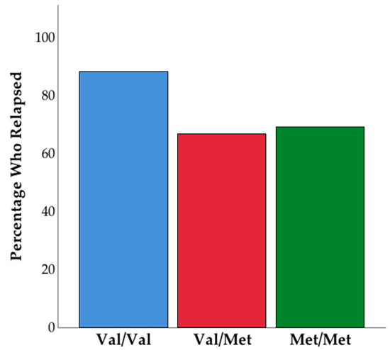 | Total (n = 70) | Val/Val (n = 17) | Val/Met (n = 27) | Met/Met (n = 26) | Abstainers (n = 19) | Relapsers (n = 51) | |