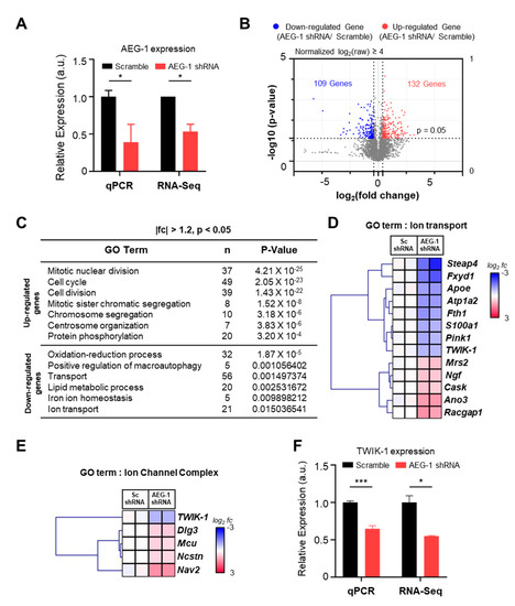 To investigate the RNA expression pattern of genes in the presence and absence of AEG-1, we performed RNA-Seq in scramble shRNA- (negative control) and AEG-1 shRNA-transfected astrocytes (AEG-1 knockdown) (Figure 1A). Bioinformatic analysis of RNA-Seq data revealed 132 up-regulated genes and 109 down-regulated genes in AEG-1 knockdown cells rather than in the negative control cells (Figure 1B, Supplementary Table S1). Further, Gene Ontology analysis revealed that most of the down-regulated genes were associated with ion transport pathways (Figure 1C). Thus, we examined the expression patterns of the genes in this GO category (ion transport) and those belonging to the GO category related to the ion channel complex (Figure 1D,E). The generated heat map representing the differences in gene expression indicated that TWIK-1 expression was positively associated with AEG-1 expression. Furthermore, TWIK-1 expression was significantly different in both ion transport and ion channel complex GO categories. qPCR analysis of TWIK-1 further confirmed that its expression was significantly reduced in AEG-1 shRNA-transfected astrocytes than in the negative control cells (p < 0.001) (Figure 1F).
