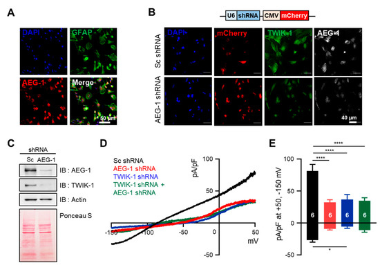 Since AEG-1 knockdown downregulates TWIK-1 mRNA, we investigated whether AEG-1 also regulates the amount and function of the TWIK-1 protein in cultured astrocytes. To determine the amount of endogenous TWIK-1 protein in accordance with AEG-1 expression levels, we performed immunocytochemistry for scramble shRNA- and AEG-1 shRNA-transfected astrocytes. First, we conducted a co-immunostaining experiment with antibodies against astrocyte marker GFAP and AEG-1 to confirm the purity of cultured astrocytes and expression of endogenous AEG-1, and most of the cells expressed both proteins simultaneously (Figure 2A). Figure 2B,C show that AEG-1 shRNA effectively reduced the levels of both proteins, AEG-1 and TWIK-1, compared with scramble shRNA-treated cells. The astrocyte has a very dynamic cytoskeleton, and if the amount of protein is large, there is a possibility that the cytoskeleton protein may be saturated [30,31]. So, we confirmed that there was no significant difference in the total amount of protein between samples by showing Ponceau S staining data. We previously reported that TWIK-1 mediates astrocyte potassium currents by forming a heterodimer with TREK-1, one of the other K2P subunits [21]. To assess the influence of AEG-1 on TWIK-1 function, we measured the whole-cell currents in differently treated astrocytes. Overexpression of AEG-1 and TWIK-1 shRNA, alone, and in combination, significantly reduced potassium currents in primary cultures of astrocytes (p < 0.01 and p < 0.001, respectively) (Figure 2D). The current density was then normalized at +50 mV and −150 mV compared to the scramble shRNA-transfected conditions (Figure 2E). These data indicate that suppression of AEG-1 decreases both the amount and function of TWIK-1 in cultured astrocytes.
