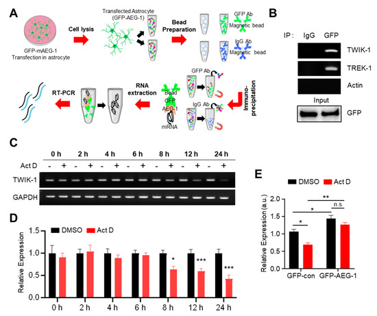 We investigated how AEG-1 regulates TWIK-1 expression. We recently reported that AEG-1 potentially up-regulates another astrocytic K2P channel, namely, TREK-1 [25]. As a follow-up study, we performed a TREK-1 promoter assay to examine the regulatory mechanism; however, AEG-1 did not display any effects. We hypothesized that, since AEG-1 is an ER RBP [17], it may also bind to TWIK-1 mRNA and regulate its stability. Thus, we investigated whether AEG-1 can bind to TWIK-1 mRNA, through RNA immunoprecipitation, followed by RT-PCR (Figure 4A). As shown in Figure 4B, AEG-1 bound to endogenous TWIK-1 mRNA, but not to actin mRNA (control), in cultured astrocytes. We then tested the stability of TWIK-1 mRNA using the RNA polymerase inhibitor Act D, which is widely used to confirm the stability of existing mRNA by preventing new RNA synthesis [32]. Incubation of cultured astrocytes with Act D for 8 h significantly down-regulated TWIK-1 mRNA in comparison with the control (GAPDH) (Figure 4C,D). To determine the effect of AEG-1 on the stability of TWIK-1 mRNA, we performed qPCR in GFP- and GFP-AEG-1-transfected astrocytes after 8-h incubation with Act D. The stability of TWIK-1 mRNA was significantly increased in GFP-AEG-1-transfected astrocytes compared to that in the GFP-transfected sample (p < 0.01) (Figure 4E), indicating that AEG-1 acts as an RBP that regulates TWIK-1 mRNA stability.