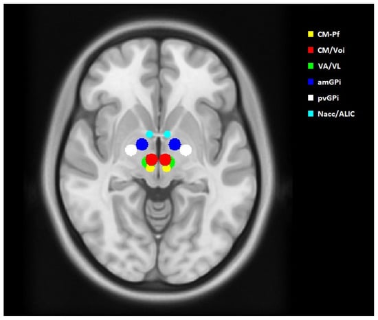 Treatment for GTS consists of cognitive behavioral therapy and pharmacotherapy, which usually contribute to a significant reduction in symptoms []. For patients with treatment refractory and disabling tics, deep brain stimulation (DBS) can be considered a therapeutic option. In 1999, the first report describing DBS for GTS was published by Vandewalle et al. []. In this study and their subsequent reports, they targeted the centromedian nucleus (CM), the substantia periventricularis (Svp), and the nucleus ventro-oralis internus (Voi) in the thalamus, successfully reducing the frequency and severity of tics []. Since then, several structures along the CBTC loops have been researched as DBS targets for GTS: the CM-parafascicular (Pf) complex [], the anteromedial globus pallidus internus (amGPi) [], the posteroventral globus pallidus internus (pvGPi) [], the ventral anterior/ventrolateral thalamus (VA/VL) [], and the nucleus accumbens/anterior limb of the internal capsule (Nacc/ALIC) []. Individual case studies have reported clinically effective stimulation in the globus pallidus externus (GPe) [] and the subthalamic nucleus []. Several reports studying the clinical outcome of GTS patients treated with DBS have shown a significant improvement in tics with all above-mentioned targets, achieving on average a comparable degree of improvement [,]. However, there is a great discrepancy between the response of individual patients in all cohorts, with some of them showing almost complete reduction in tics and some barely responding to the therapy [].