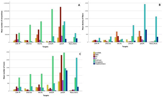 There was a significant difference between the number of streamlines connecting each VTA to individual seed regions (pre-SMA: chi-square = 36.53, p < 0.001; SMA: chi-square = 53.42, p < 0.001; M1: chi-square = 55.12, p < 0.001; S1: chi-square = 41.38, p < 0.001; prefrontal cortex: chi-square = 16.77, p = 0.005; amygdala: chi-square = 52.11, p < 0.001; hippocampus: chi-square = 37.1, p < 0.001; df = 5) (Figure 2A). The highest number of tracts connecting to the sensorimotor cortex projected from the pvGPi (mean number of streamlines: M1: 2,252,929.04 ± 1,740,254.85; SMA: 995,187.57 ± 762,682.91; pre-SMA: 284,831.46 ± 380,020.22; S1: 407,883.68 ± 271,275.25). The amGPi had the most streamlines connecting to the prefrontal cortex (mean number of streamlines: 2,107,467.07 ± 259,811.28). The Nacc/ALIC showed the strongest connection to the hippocampus (mean number of streamlines: 243,571.79 ± 378,577.93), and the pvGPi to the amygdala (mean number of streamlines: 1,325,948.14 ± 431,272.06). Comparing the thalamic targets, the VA/VL had the most tracts connecting to the motor cortex (mean number of streamlines: M1: 807,011.14 ± 762,080.53; SMA: 487,448.86 ± 398,613.72; pre-SMA: 257,989.57 ± 345,232.07) and to the prefrontal cortex (mean number of streamlines: 1,325,091.14 ± 1,304,141.08). The pvGPi had significantly more streamlines connecting to M1 and SMA in comparison to the amGPi (p < 0.001).