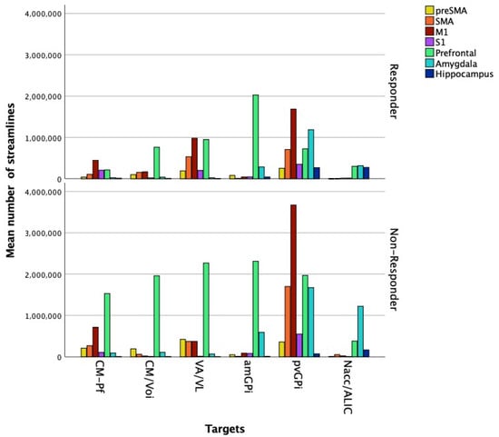 Diagram summarizing the mean number of streamlines from each target to the different seed regions in responder and non-responder patients. Datapoints represent segmented analysis of the hemispheres (responders, n = 10; non-responders, n = 4).