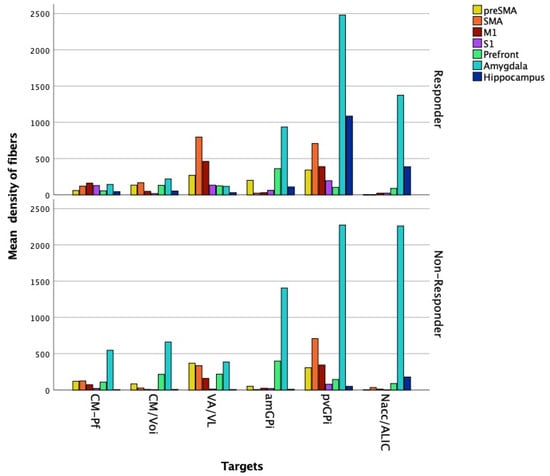 Diagram summarizing the mean density of fibers in the seed regions of the tracts projecting from the individual targets in responder and non-responder patients. Datapoints represent segmented analysis of the hemispheres (responders, n = 10; non-responders, n = 4).