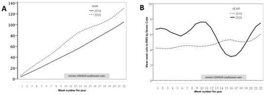 Stroke code activation. (A) Cumulative stroke code activations to stroke units according to the year. (B) Mean week calls to emergency medical services (EMS) by stroke code according to the year.