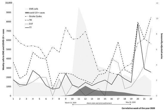 Along the same lines as what happened in our region, hospitalizations for stroke or transient ischemic attacks in other countries fell during the worst period of the COVID-19 outbreak [28]. Intravenous thrombolytic treatments also decreased, while endovascular treatments remained unchanged and even increased in the area of maximum expression of the outbreak [29]. The limited hospitalization of less severe patients and delays in hospital admission, due to the overload of the emergency system by COVID-19 patients, may explain these data.