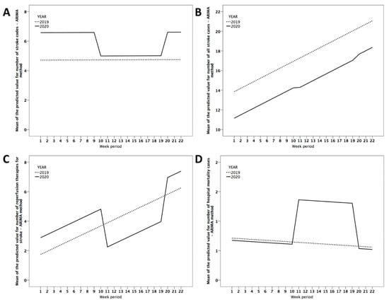 Figure 3 is a visual representation that shows the average value predicted by the ARIMA model of the main variables in relation to the period of time studied. It can be seen that during the confinement of the population in the year 2020, the linear effect observed in a year without critical incidents such as 2019 is clearly lost, producing a fall in the number of activations of the stroke code (Figure 3A), the number of hospital admissions for stroke (Figure 3B), and the number of reperfusion treatments (Figure 3C) and an increase in mortality (Figure 3D).