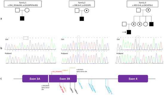 Three novel pathogenic variants in exon 3B of PLP1 were detected: c.354_355delAG p.(G120PfsTer83), c.398A>C p.(H133P), c.435G>A p.(W145Ter) (Figure 1b,c). The variant was de novo in family 1; probands in family 2 and 3 inherited the mutation from the mother (aged 41 years in Family 2 and 36 years in Family 3). In family 3, also the maternal aunt (aged 35 years) and grandmother (aged 74 years) were tested positive for the [c.435 G>A; p.(W145Ter)]. All the female carriers have no neurological symptoms at their current ages.