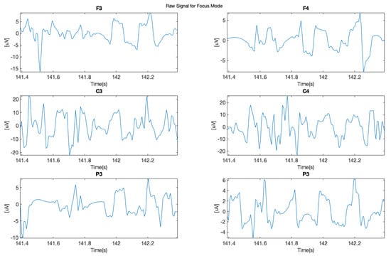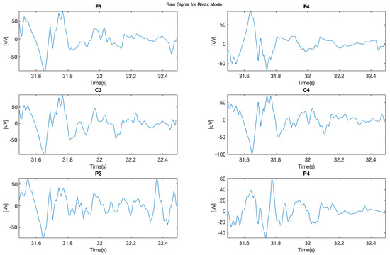 In this study, we chose two signal samples in order to perform further analysis. The first sample (Figure 5 shows raw signal recorded during relax mode for each of the applied six electrodes F3, F4, C3, C4, P3, and P4), where it is possible to see clear “alpha” wave on the 1 s sample.