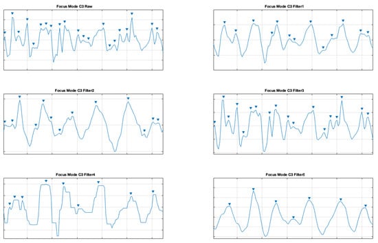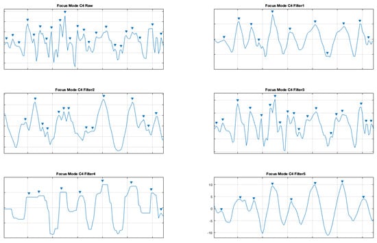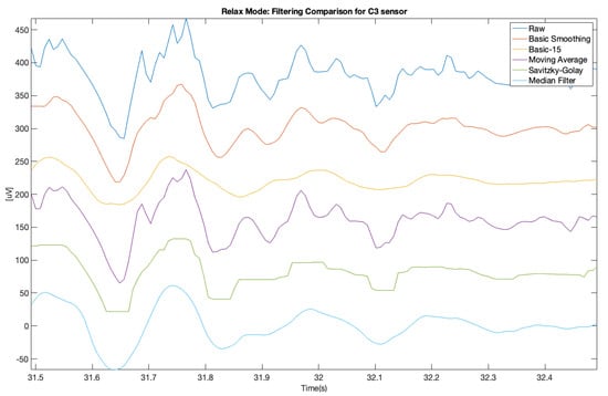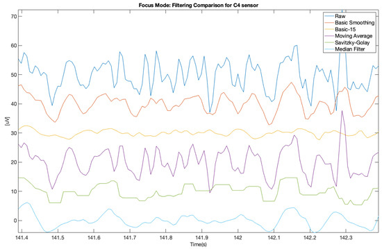 In order to make the obtained data more legible the authors decided to apply and compare various smoothing filters. As the data is initially preprocessed by the device itself (0.5–45 Hz, 5-th order Sinc filter) it was very challenging to choose appropriate filters, as the data for analysis did not contain full information. It was not raw, clinical-level data. Due to the blinking artifact, the data was filtered with a high-pass 4-th order Butterworth filter, with the cut-off frequency of 4 Hz. The very first step involved baseline removal [49]. For this study’s purposes, various smoothing filters were applied at the initial stage in order to improve the quality of the analyzed data. As the data have already been preprocessed during recording, they did not contain full information.