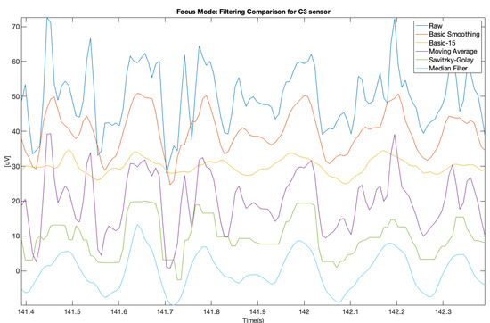 In [10], the authors focused on design, development, and testing of various smoothing filters of clinical quality data. For these study purposes they decided to implement similar filters, but on data recorded with the customer-grade, inexpensive, off-the-shelf BCI-headset—Emotiv EPOC Flex. As it was mentioned above, the obtained data quality differs from the one from clinical signals, which affected the choice of the applied filtering. Implementation of smoothing filtering usually positively affects the quality of EEG data, as it makes them more legible for potential diagnostic purposes and does not affect their content [10,11,12].