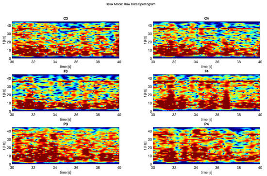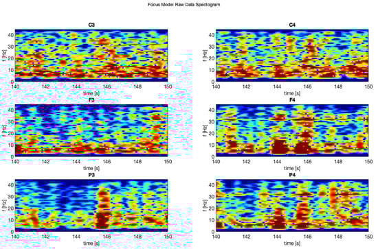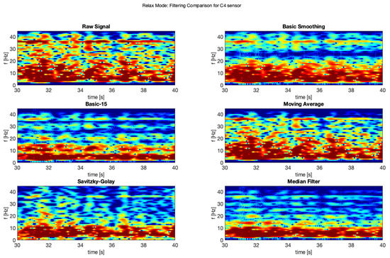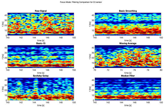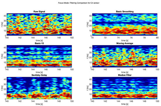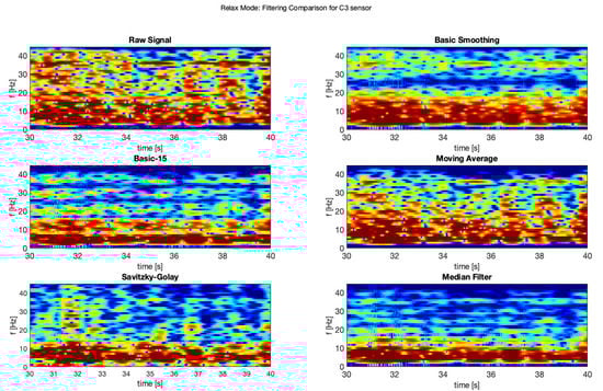 It is clearly visible that the 3rd filter (moving average) is the proper one for this purpose, unlike in [10]. Other filters removed too much crucial information from these samples and flattered the characteristic “peaks” in the EEG signal. Similar situation is visible at 10 s sample on spectrograms (Figure 11, Figure 12, Figure 13, Figure 14, Figure 15 and Figure 16). At first it was presented in Figure 11 and Figure 12.