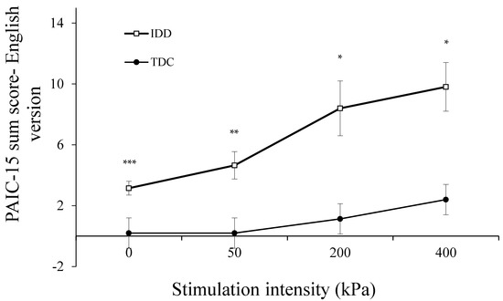 Among both the IDD and TDC groups, the PAIC-15 scores correlated moderately and significantly with pressure stimulation intensity (r = 0.55, p < 0.001 and r = 0.45, p < 0.001, respectively), suggesting a stimulus–response relation for the PAIC-15. Yet, the slopes of these stimulus–response functions were different among the groups, as can be seen in Figure 1: that of the IDD group was steeper than that of the TDC group (2.37, R2 = 0.96 vs. 0.75, R2 = 0.87), manifested also by the significant group X condition interaction.