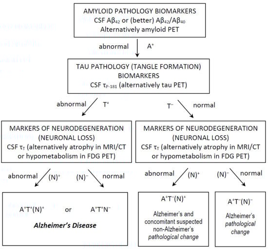 - Jack, C.R., Jr.; Bennett, D.A.; Blennow, K.; Carrillo, M.C.; Feldman, H.H.; Frisoni, G.B.; Hampel, H.; Jagust, W.J.; Johnson, K.A.; Knopman, D.S.; et al. A/T/N: An unbiased descriptive classification scheme for Alzheimer disease biomarkers. Neurology 2016, 87, 539–547. [Google Scholar] [CrossRef]