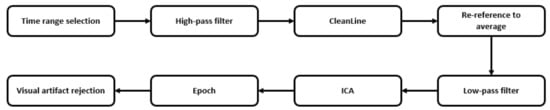 Different signal transformations were applied, aiming to expand the amount of information. Signal preprocessing was performed following the pipeline implemented by [] in EEGLAB Software (Matlab). These procedures try to minimize the external noise and artefacts that are usually present in a raw EEG signal. The following steps were conducted, which are also summarized in Figure 1: