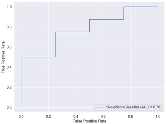 Seven different models were evaluated for the binary classification: Decision Tree, EN, SVM, RF, kNN, Gaussian NB and Multinomial NB (Table 2). kNN model, a non-parametric supervised classification method, achieved the best performance, showing a Sensitivity of 0.88, an F1-Score value of 0.83 and a Specificity of 0.5. The confusion matrix from the best model (kNN) is shown in Figure 5, as well as its ROC curve in Figure 6.