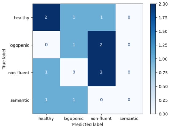 Following the same pipeline described in the binary classification model, a multiclass classification model was applied in order to distinguish between nfvPPA, svPPA, lvPPA and CG. The same pre-processing steps, hyperparameter tuning techniques and cross-validation options were applied here. All models performed a multiclass classification with 4 different classes (one per each group of patients) and using F1-Score metric as their main aim.