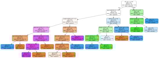 In the training process, the selection of the best hyperparameters for each model was accomplished by a Bayes-search optimization algorithm (this optimization algorithm created a full space with all possible hyperparameter values and applied Bayes Theorem in order to find those exact values that minimized the error function). All models performed a binary classification using a 10-fold cross-validation using F1-Score metric (2) as the main metric. This metric was selected to optimize the classification problem, which was imbalanced. Precision (3), Sensitivity (4), Specificity (5) and Youden Index (6) are also displayed.