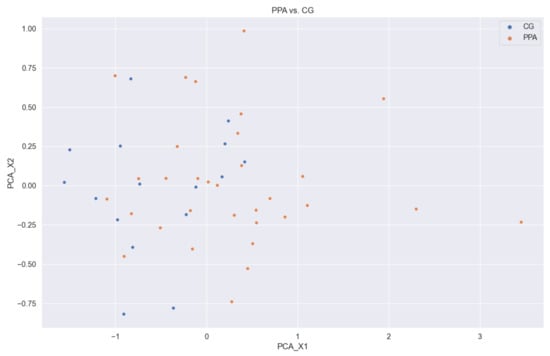 In order to explain the complexity of our working dataset, we applied Principal Component Analysis (PCA) to reduce the dimensionality. PCA aims to find the directions of maximum variance in high-dimensional data and projects them onto a new subspace with equal or fewer dimensions than the original one. Hence, it reduces the number of features by combining them linearly. We performed a dimensionality reduction to only two principal components. Accordingly, the visualization of all subjects as data points is allowed by looking for the linear combination of all the extracted features into these two principal components. In this way, it is possible to visualize the multi-dimensional data distribution and evaluate how mixed are the data instances in the representation space.