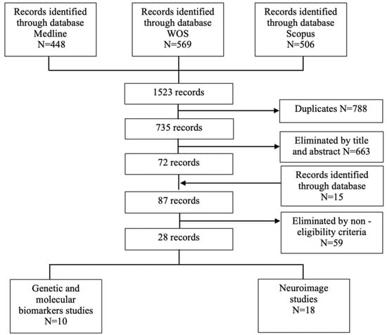 As displayed in Figure 1, a total of 28 articles were included in our systematic review. Importantly, an initial literature evaluation allowed us to identify two main biomarkers categories: (1) genetic and molecular biomarkers and (2) neuroimaging-based biomarkers.