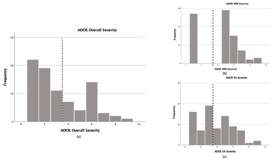 - Gotham, K.; Pickles, A.; Lord, C. Standardizing ADOS Scores for a Measure of Severity in Autism Spectrum Disorders. J. Autism Dev. Disord. 2008, 39, 693–705. [Google Scholar] [CrossRef]