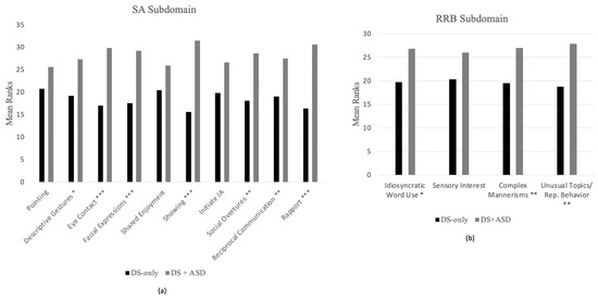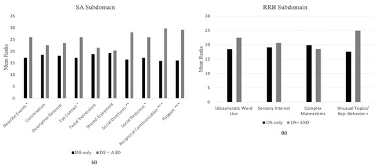 - Godfrey, M.; Hepburn, S.; Fidler, D.J.; Tapera, T.; Zhang, F.; Rosenberg, C.R.; Lee, N.R. Autism spectrum disorder (ASD) symptom profiles of children with comorbid Down syndrome (DS) and ASD: A comparison with children with DS-only and ASD-only. Res. Dev. Disabil. 2019, 89, 83–93. [Google Scholar] [CrossRef] [PubMed]