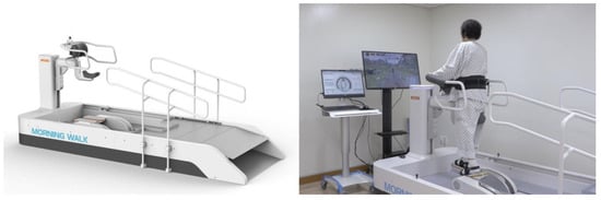 Participants received RAGT with Morning Walk® (Figure 1, Curexo, Seoul, South Korea). This is an end-effector type robot and the first gait training robot to use a saddle for weight support; previous robots used harnesses. Patients can access the robot in a wheelchair and move directly to the saddle. Therefore, it takes less time to get on and off the robot than previous gait training robots, which is the advantage of the Morning Walk®. It produces a gait cycle according to the trajectory of the footplate. Only the patient’s feet were attached to the robot, and the knee and hip joints moved freely. In front of the Morning Walk®, there is a virtual reality screen. During RAGT, patients can experience walking through a park or forest because it provides visual feedback according to the gait speed.
