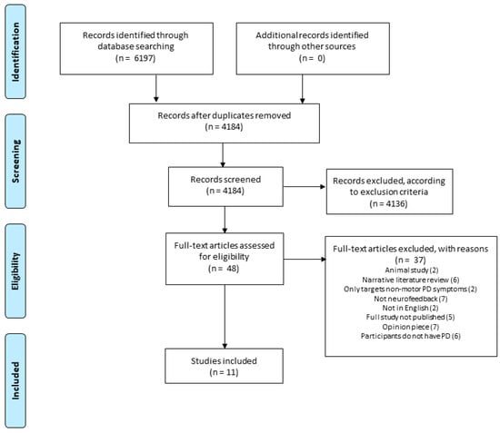 The review considered all studies that examined neurofeedback designed as a treatment for PD motor symptoms. This included studies that examined participants’ success at neurofeedback without any measurement of clinical outcomes. Relevant studies included neurofeedback training using any protocol (i.e., targeted brain activity), duration, frequency, or intensity. Neurofeedback evaluation considered any target brain activity such as EEG, deep brain recording, and other brain imaging (e.g., fMRI/positron emission tomography (PET)), and involved measurements from any brain region.