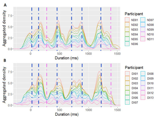 Aggregated densities of SMS with the test sentence “The couple watched the stars twinkle”. (A) displays the performance of the control group, and (B) that of the dyslexic group. Vertical blue lines indicate onsets of vowels, and pink lines indicate onsets of sonorant nuclei.