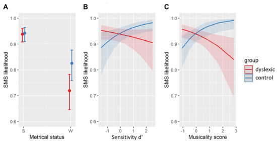 Likelihood of SMS estimated in adult participants with dyslexia (red lines) vs. controls (blue lines), depending on (A) metrical weight of a syllable, (B) individual sensitivity to acoustic cues d’ and (C) individual musicality scores.