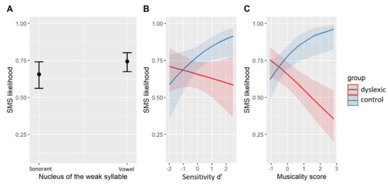 Likelihood of SMS estimated in weak syllables, for (A) the main effect of syllable nucleus, (B) the interactions of group and d’-scores and (C) the interaction of group and musicality scores. Dyslexic data are plotted in red, control data in blue.