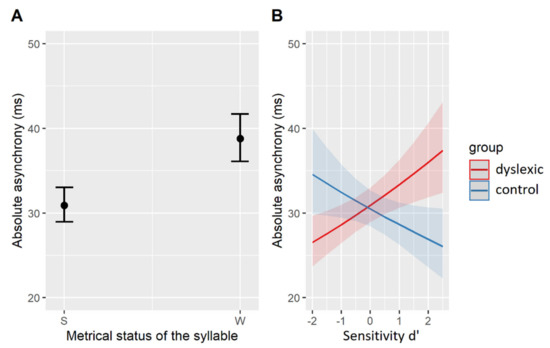 Predicted values of absolute asynchronies in (A) strong vs. weak syllables, and (B) dyslexic (red) vs. control (blue) participants with variable d’-scores (plotted on the x-axis).