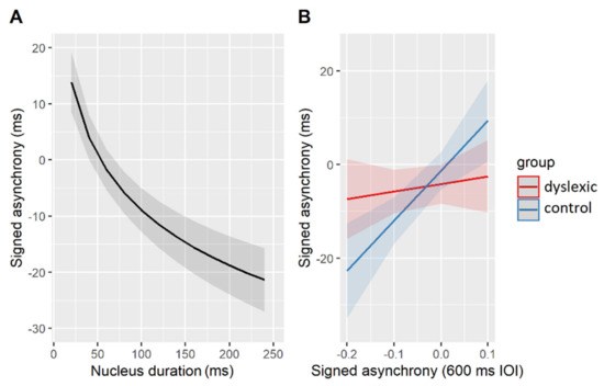 Predicted signed asynchronies in (A) syllable nuclei of variable duration, and (B) dyslexic (red) vs. control (blue) participants with variable signed asynchronies measured in the paced tapping task with the targets presented at IOI of 600 ms (plotted along the x-axis). On the y-axis, 0 ms refers to the nucleus onset.