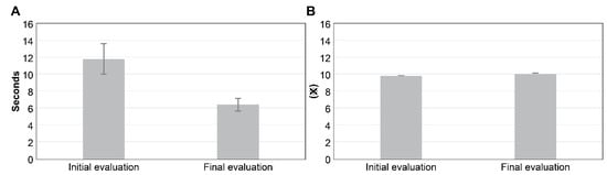 Grasping force measurements. (A) Time required to complete the grasping force task; (B) three-axis composite value. ※ Unit: m/s2. The time to complete the task was reduced from 11.82 ± 1.85 to 6.39 ± 0.84 compared with the initial evaluation. Compared with the initial evaluation, the triaxial composite value increased from 9.73 ± 0.03 to 10.00 ± 0.02.