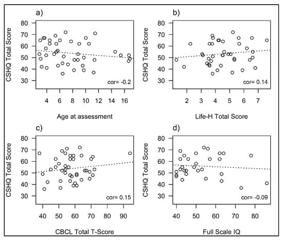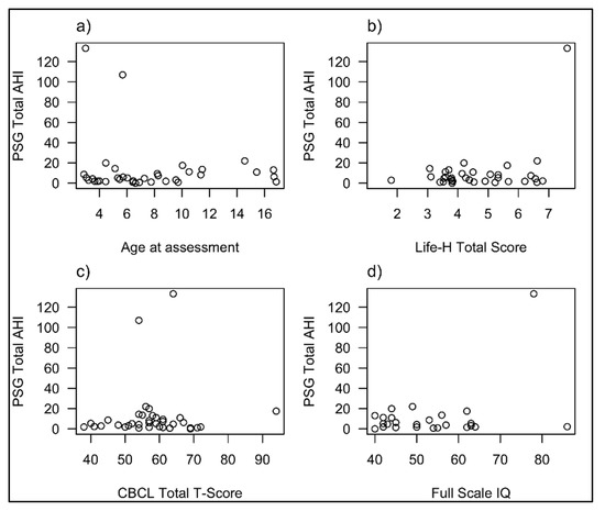 Correlations between a range of sleep study measures and variables from the CSHQ and behavioural, functional and IQ measures were sought. This included evaluating the relationship between PSG parameters (sleep efficiency, AHI, OAHI, CAI, CO2 Max and Arousal Index) and CSHQ scores and sub-scales, against age, BMI, Life H total score, CBCL total T-scores, Internalising and externalizing T-scores and SB-5 NVIQ, VIQ and FSIQ. No statistically significant correlations were seen between any sleep variables with the test variables. Figure 1 displays the relationship between CSHQ total scores and age (a), overall functional ability (b), general behaviour (c) and IQ (d) and Figure 2 displays the relationship between total AHI (Apnoea-Hypopnea Index) on PSG and these variables in those participants who had a sleep study. The two children with very severe OSA represent the outliers on these graphs.